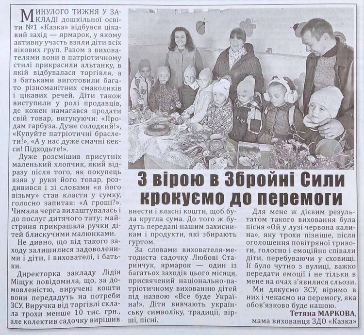 1. В ЗДО проводилися заняття з вивчення та створювання українських символів (аплікації, малювання); доповнювалися осередки українсько-патріотичного виховання; виготовлялися листівки для привітань захисників, проводилися ярмарки, виручені кошти від яких будуть передані ЗСУ; проводилися екскурсії з дітьми до пам’ятника Захисника Вітчизни. Вихованці Новофастівського садочку привітали матір полеглого героя-земляка Башняк В.М.